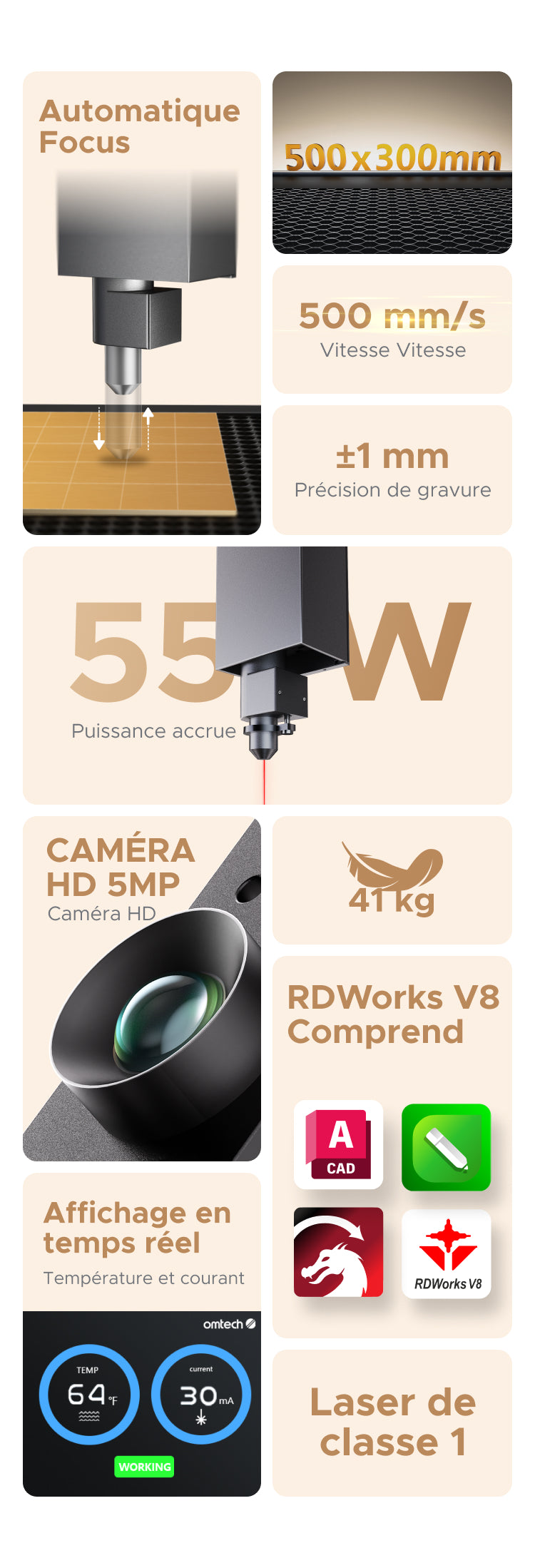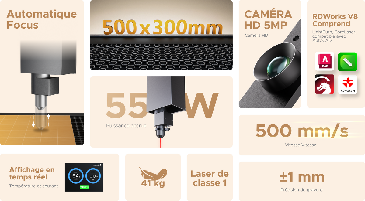 Investissez dans un graveur laser de CO2 50W avec une zone de travail de 300x500mm pour élargir vos capacités créatives et industrielles, et réaliser des projets de gravure et découpe de haute qualité avec une grande efficacité et précision.